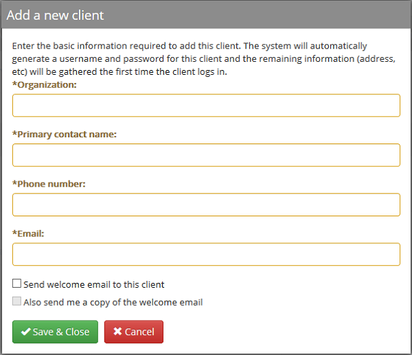 - To send your client a welcome email that includes their username and password, check the box "Send welcome email to this client"